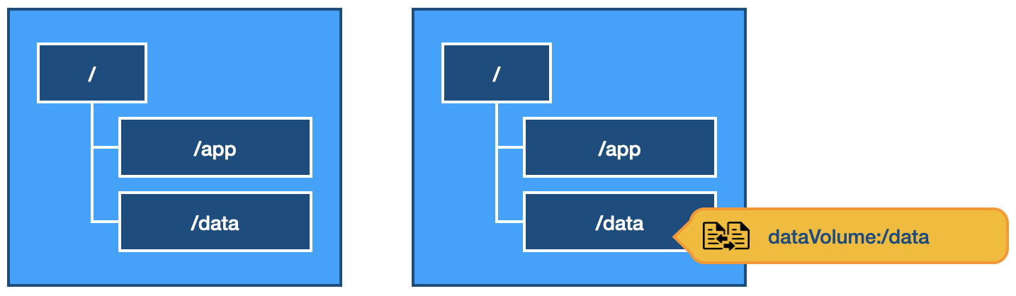 Az alábbi példában egy konténerben futó alkalmazás az adatait a /data könyvtárban tárolja. A bal oldali szerkezetben ezek az adatok a konténer saját, belső fájlrendszerében helyezkednek el, így a konténer „eldobásakor” az abban tárolt tartalom is elvész. A jobb oldali felépítésben a dataVolume nevű, külső, statikus kötetet a /data könyvtárhoz csatoltuk, eltakarva ezzel a könyvtár eredeti tartalmát. Ezzel minden, a /data könyvtárban végzett fájlművelet ebben a külső kötetben történik. Maga a konténer ezzel eldobhatóvá válik, hiszen annak adattartalmát a kötet őrzi, ha pedig azt újra kell építeni, a konténer a kötet tartalmát ugyanúgy el tudja majd érni.